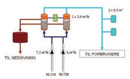 Vandet pumpes direkte fra boringerne til to parallelle trykfiltre, hvorfra det færdige drikkevand distribueres til forbrugerne.